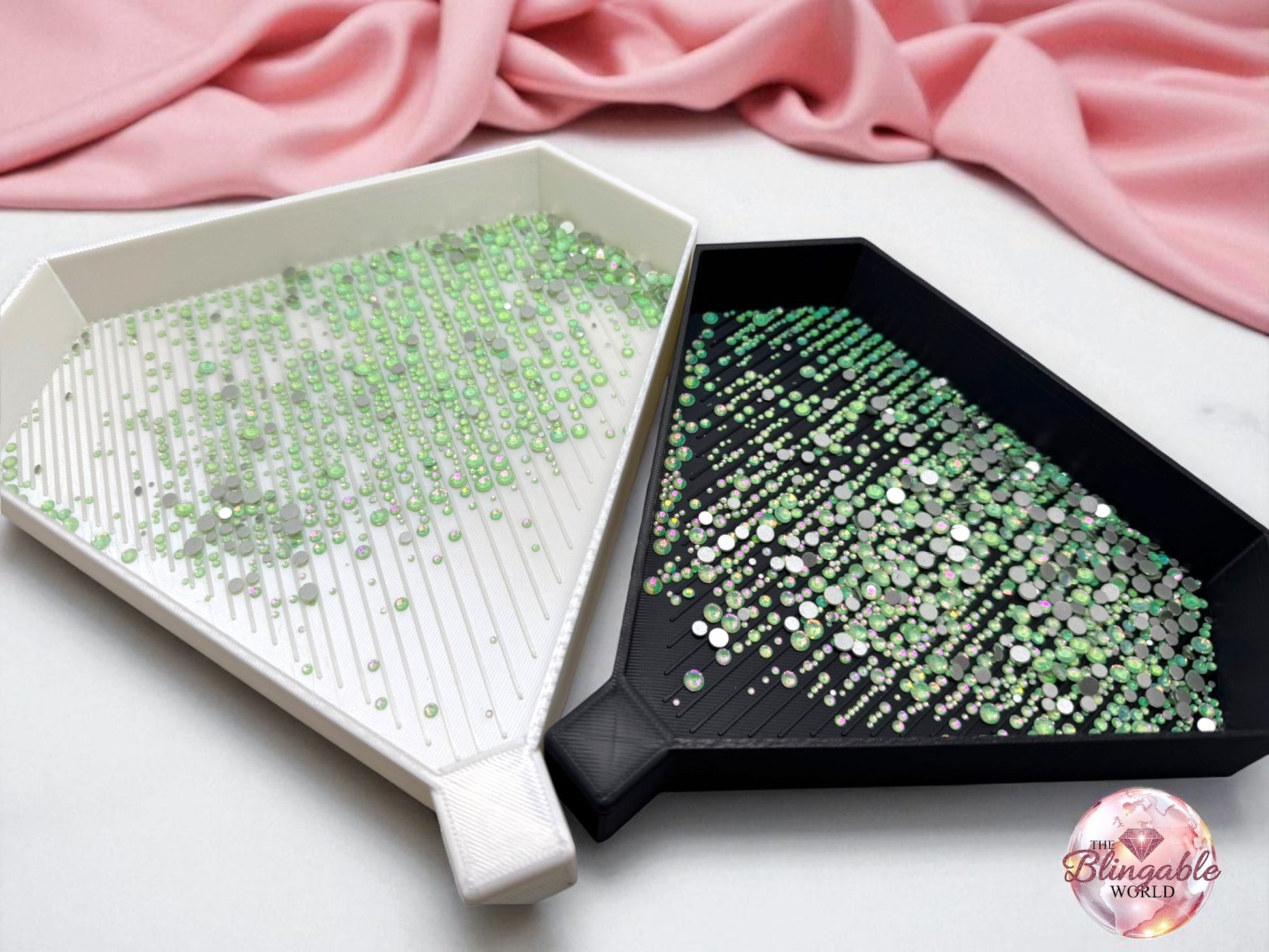 Organize your rhinestones in style with these diamond-shaped sorting trays—beautifully designed for both function and sparkle. Each tray features a removable plug for easy, mess-free pouring and a grooved base to perfectly align your rhinestones for quick pick-up.